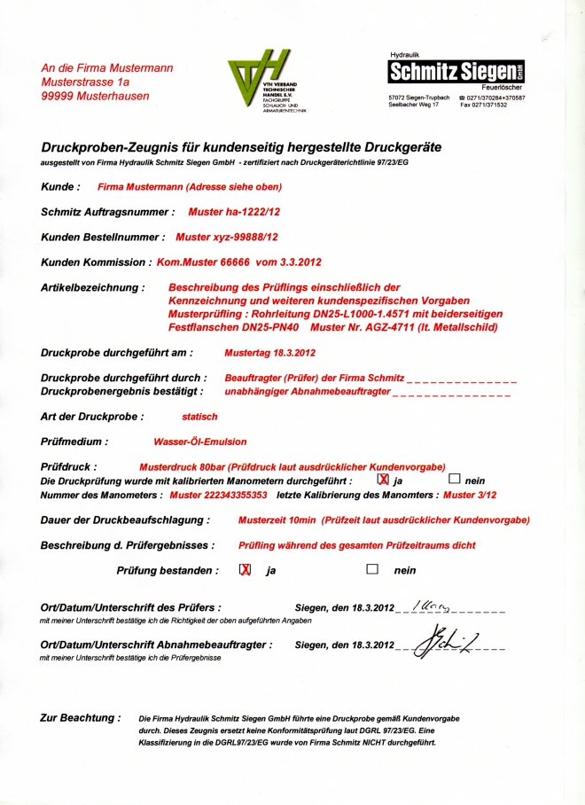 Der maximale Prüfdruck liegt bei 1000bar. Wir prüfen mit einer Wasser-Öl-Emulsion. Ein Prüfzeugnis wird auf Wunsch ausgestellt.